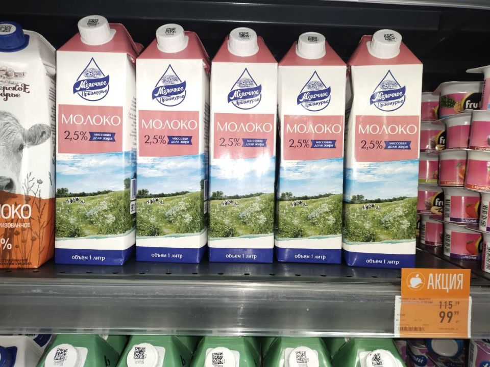 В ассортименте — молоко из Артема, Арсеньева, Уссурийска, Хороля, Спасска-Дальнего, а также из Надеждинского, Октябрьского, Чугуевского и Ольгинского округов.