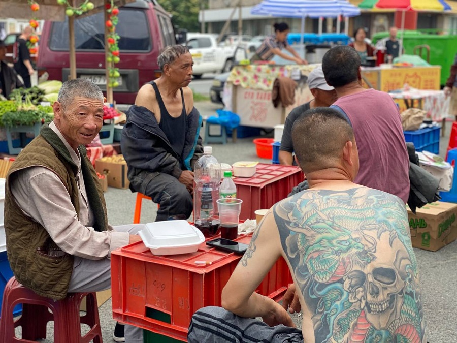 Внимание репортёров привлек китаец с татуировкой на всю спину. В кадре он был без футболки.