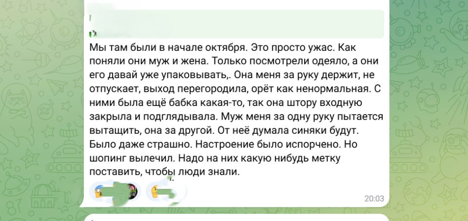 Когда туристы отказались от неподходящей вещи, ситуация резко накалилась. По их словам, сотрудники магазина повели себя агрессивно: их заперли в отделе, перешли на крик и отказались возвращать деньги.
