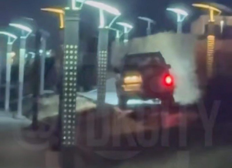 Машина снесла несколько опор освещения и повредила леера, после чего скрылась.