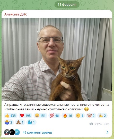 Приморский миллиардер из списка Forbes, глава ДНС Дмитрий Алексеев провёл эксперимент, разместив в соцсетях после серии длинных постов фото с котом, сообщает PRIMPRESS. Таким образом он решил проверить, что вызывает больше реакций у его подписчиков.