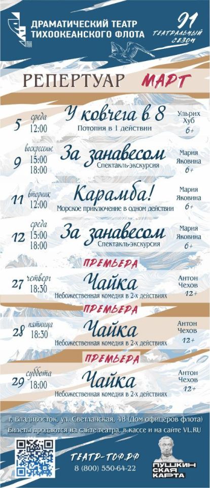 Все желающие смогут увидеть очередную премьеру 91-го театрального сезона – спектакль «Чайка» (12+) в постановке режиссера Сергея Руденка. Небожественную комедию в двух действиях покажут три раза. В репертуаре на март также представлены спектакли «У ковчега в 8» (6+) и «Карамба» (6+). Кроме того, жители и гости Владивостока смогут посетить – спектакль-экскурсию «За занавесом» (6+).
