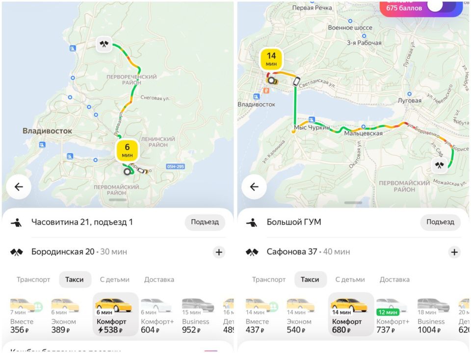 Не менее дорого доехать из центра в район улиц Русской и Бородинской. Так, от Дальпресса до Русской предлагают поездку в «экономе» за 579 рублей, «комфорт» обойдется в 748 рублей, «комфорт+» - 794 рубля.