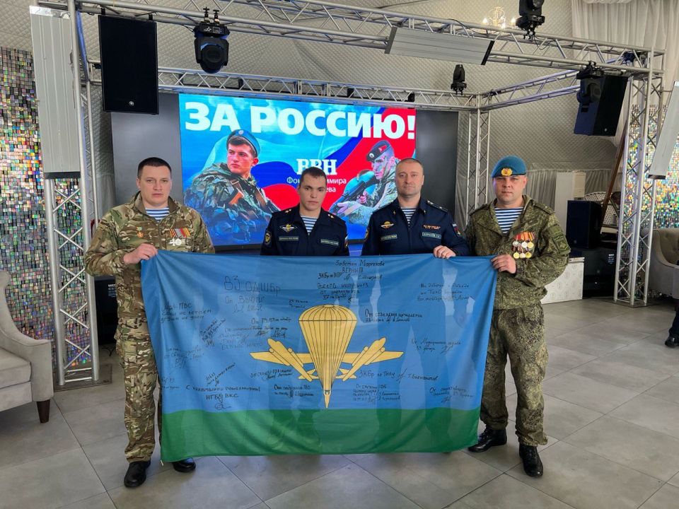 На встрече Владимир Николаев передал приветствия от бойцов и развернул перед присутствующими знамя, подписанное героями 83-й ОДШБр для фонда ВВН и своих родных. Это стало символом связи и единства тех, кто защищает Родину, и тех, кто поддерживает их в тылу.