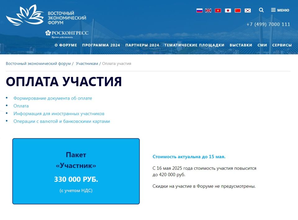 В этом году минимальная стоимость участия в юбилейном Десятом Восточном экономическом форуме (пакет «Участник») составит 330 тысяч рублей. Информация об этом появилась на официальном сайте мероприятия, сообщает PRIMPRESS. Напомним, что ВЭФ состоится во Владивостоке на острове Русский на территории кампуса Дальневостчоного федерального университета с 3 по 6 сентября.