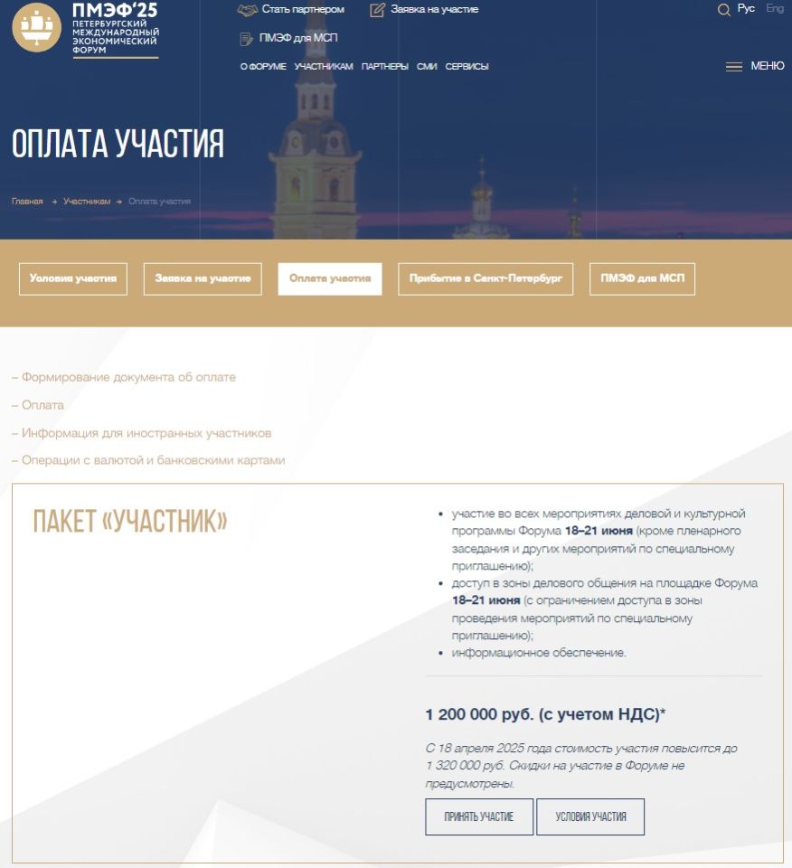 К слову, стоимость участия в Петербургском международном экономическом форуме, который пройдет с 18 по 21 июня, составит 1,2 миллиона рублей, то есть приблизительно в четыре раза дороже.
