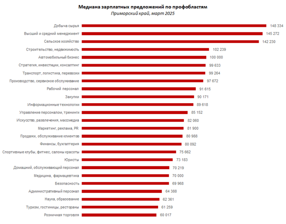 В Приморье медиана предлагаемых зарплат по итогам марта составила 80 тысяч рублей. Этот показатель оказался на 9,8 тысячи рублей больше, чем год назад.
