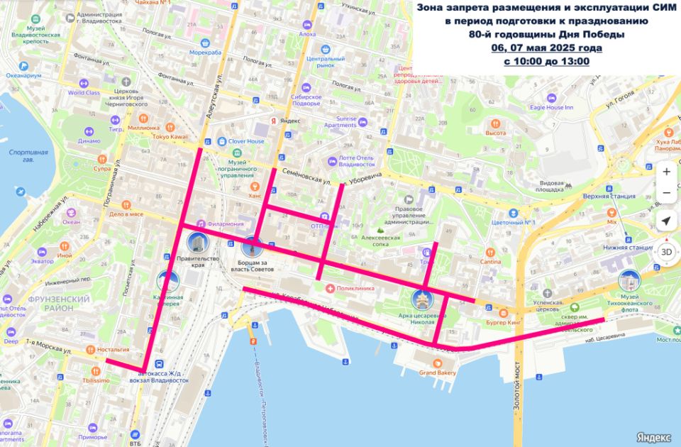 Во Владивостоке введены временные ограничения на движение и парковку электросамокатов в связи с празднованием Дня Победы. Согласно сообщению управления городской среды администрации города, данные меры будут действовать на центральных улицах города во время репетиций парада и в день 80-летия Победы в Великой Отечественной войне, сообщает PRIMPRESS.
