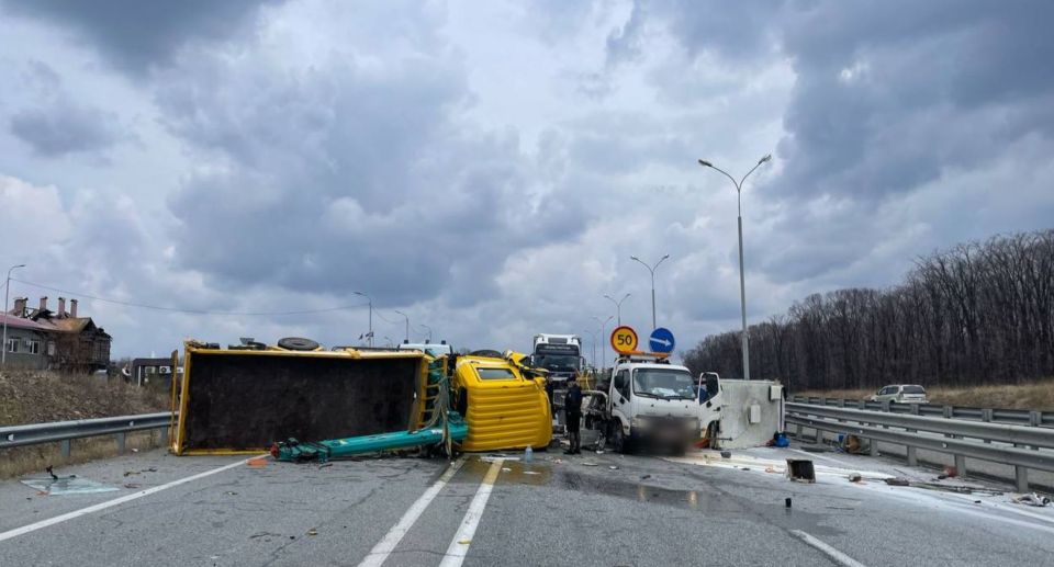В результате жесткого столкновения два грузовика перевернулись, и еще один оказался поврежден. По предварительным данным, пострадал пассажир эвакуатора - его доставили в больницу.