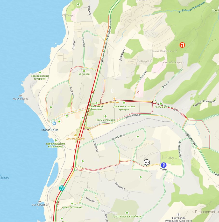 Так, одним из самых проблемных участков оказался Некрасовский путепровод и прилегающие к нему улицы - Русская, Постышева, проспект 100-летия Владивостока и другие. О каких-либо ДТП и дорожных работах здесь не сообщалось, но почти вся дорога размечена в красный и темно-красный цвет.