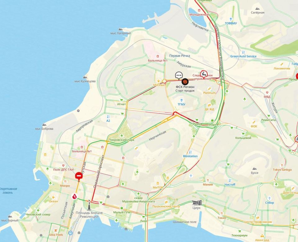 Не обошлось без проблем и в центре города - крупные пробки наблюдаются на Океанском проспекте, проспекте Красного Знамени и Алеутской.