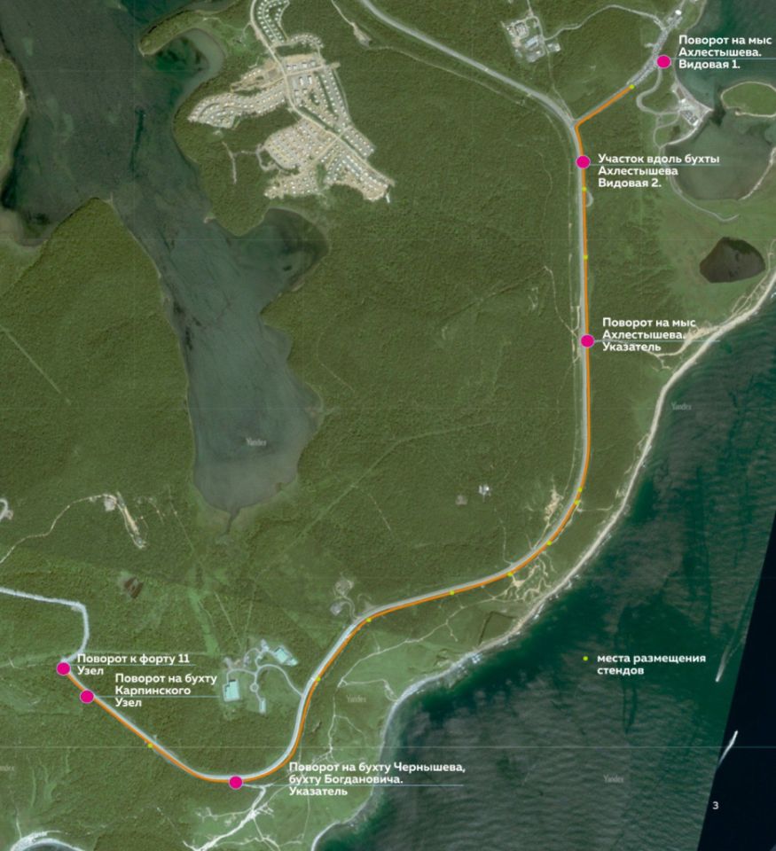 Кроме того, проект предусматривает не только создание магистральной части велодорожки, но и комплекс дополнительных мероприятий по благоустройству. На мысе Ахлёстышева, в дополнение к расширению велодорожки, будет установлен памятный знак – «Нулевой километр велодорог России». По всему маршруту будут размещены малые архитектурные формы и павильоны, которые обеспечат велосипедистам места для отдыха, пикников и осмотра окружающих красот.