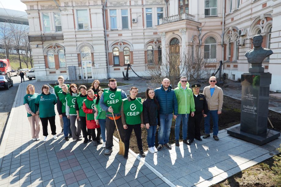 Сотрудники Сбербанка каждую весну облагораживают территорию возле памятника Герою Советского Союза Василию Григорьевичу Зайцеву. Василий Григорьевич служил в финансовой службе Тихоокеанского флота с 1937 года. Именно возле этого здания, где сейчас находится штаб флота, установлен бюст.