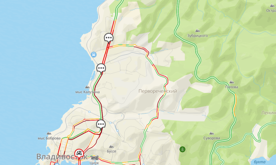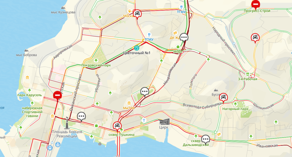 Также сложности с движением наблюдаются в центре города по улицам Алеутской, Светланской, Океанскому и Партизанскому проспектам.