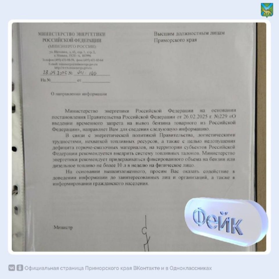 В социальных сетях начал активно распространяться фейковый документ, согласно которому в разных субъектах России, в том числе и в Приморье, могут ввести ограниченную выдачу бензина по талонам. Некоторые Telegram-каналы успели подхватить тему, но в правительстве региона опровергли эту информацию, сообщает PRIMPRESS.