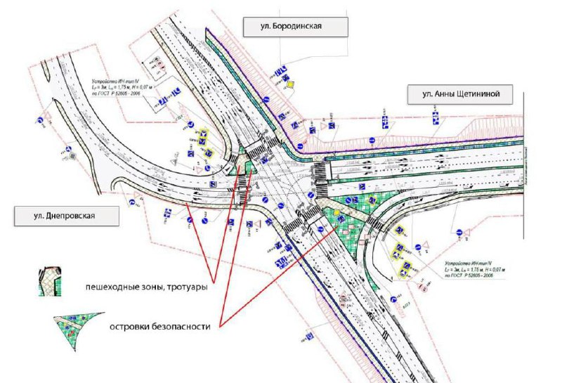 Для повышения безопасности пешеходов предусмотрено строительство тротуаров и наземных переходов, а на пересечении улиц Анны Щетининой, Днепровской и Бородинской будут установлены два островка безопасности, которые обеспечат удобное пешеходное движение.