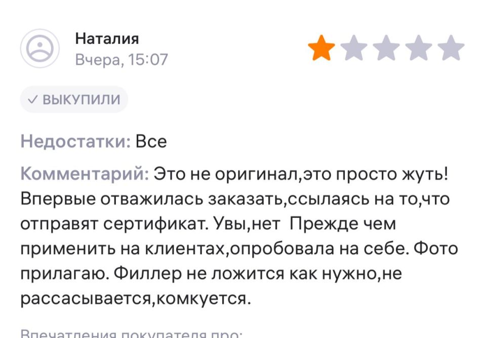 Вероятно, этот отзыв оставила косметолог, поскольку она упомянула, что «прежде чем применить на клиентах, опробовала на себе». К нему есть большие вопросы, ведь купленные на маркетплейсе филлеры вряд ли имеют все подтверждающие подлинность товара документы. Никто не отрицает, что это может быть подделка.