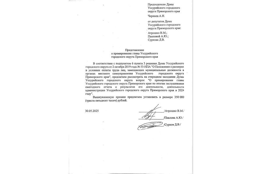 Премия была назначена главе округа по итогам ежегодного отчёта о деятельности администрации, который депутаты признали удовлетворительным. Решение о поощрении было принято на заседании Думы, прошедшем в июне.