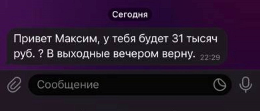 «Мне пришло сообщение от мамы моей подруги с вопросом, не будет ли у меня 31 тысячи рублей до выходных. Тогда я понял, что Евгению взломали мошенники, так как у неё другой стиль общения в сети, да и не станет же взрослая дама занимать у человека, который ей в сыновья годится, такую крупную сумму денег. На аккаунт я сразу пожаловался», — рассказывает мужчина, который не повёлся на уловку и не перевёл деньги мошенникам.