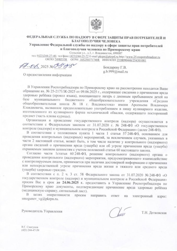Известно, что питанием в пришкольных лагерях Владивостока, в том числе и в лагере школы №18, занимается компания МКК из Мордовии. В Telegram-канал также распространилась информация, что МКК в 2024 году была отстранена от организации питания детей в детских садах Владивостока, но летом 2025 года снова стала этим заниматься даже без конкурса.