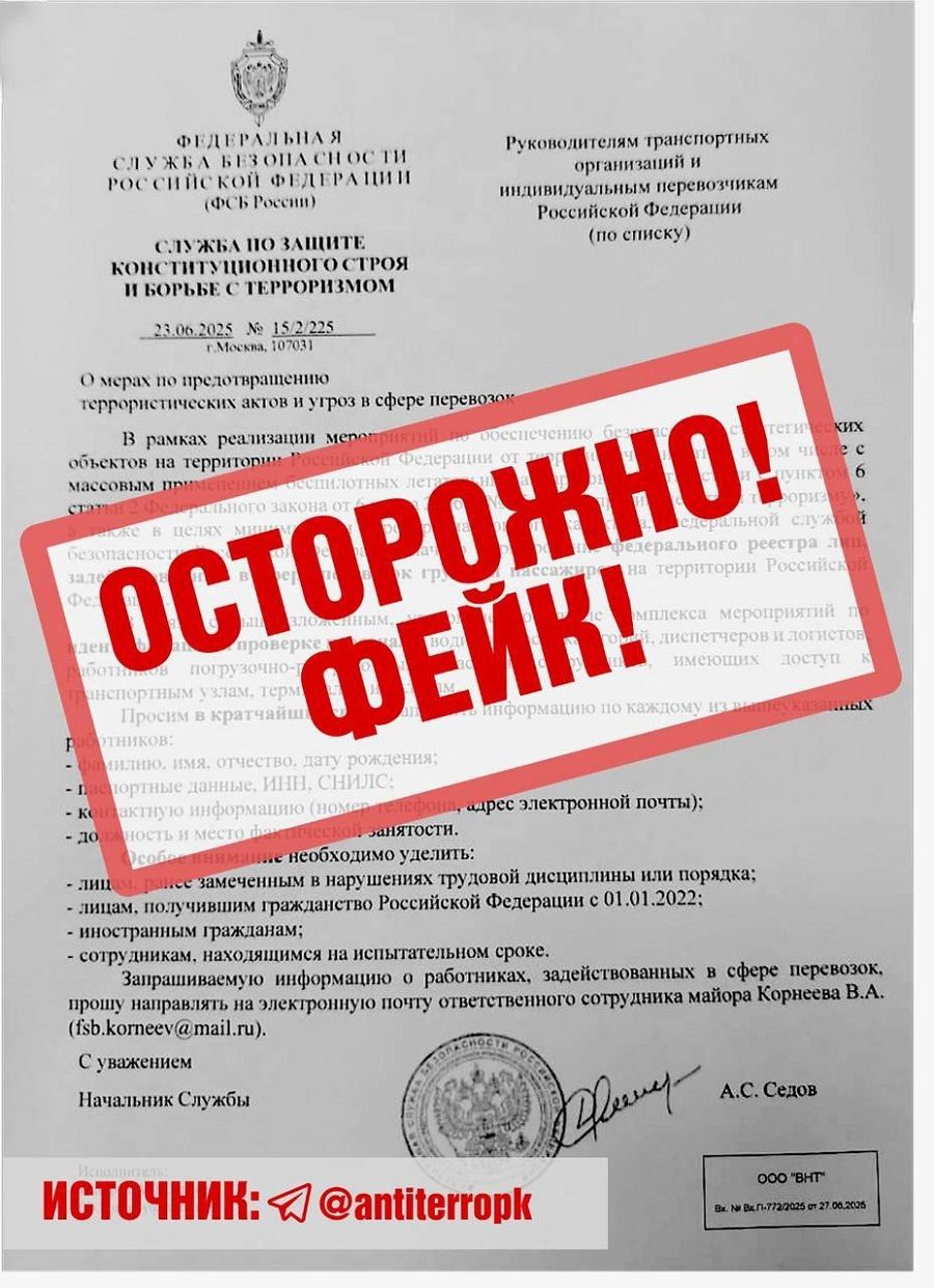 Как уточнили в Антитеррористической комиссии региона, на электронные адреса предприятий и частных перевозчиков поступают фейковые обращения якобы от «Службы по защите конституционного строя и борьбе с терроризмом ФСБ России».