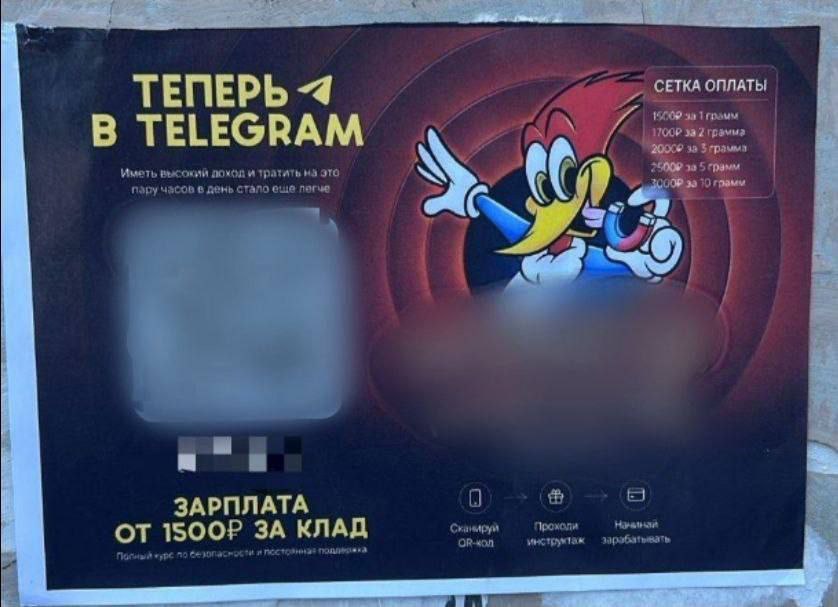 На одном из объявлений известный всем детям 90-х дятел Вуди предлагает каждому желающему подработать так называемым «кладменом» – пернатый мультперсонаж презентует сетку оплаты и сулит «высокий доход за пару часов в день».