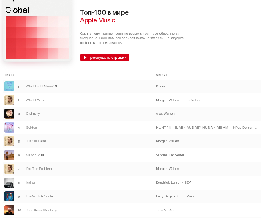 Глобальный музыкальный топ Apple Music сегодня претерпевает радикальные изменения. Место привычных поп-гимнов и отполированных хитов занимают треки, больше напоминающие голосовые заметки от Drake, ASMR-записи от Billie Eilish или TikTok-драмы от Sabrina Carpenter. Имена вроде HUNTRX и EJAE, малоизвестные широкой публике, уверенно держатся в чартах рядом с мировыми звездами, заставляя многих задаться вопросом: «Это точно музыка?»