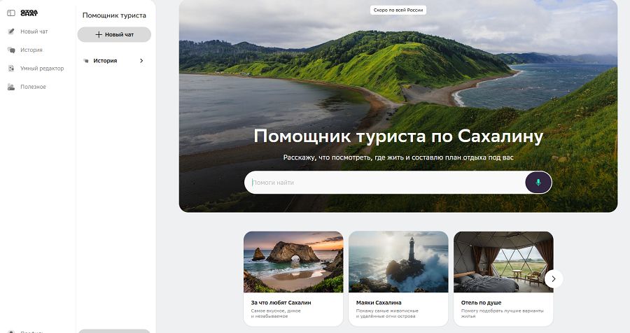 Сбер выпустил диалогового AI-ассистента «Помощник туриста», который упрощает организацию путешествий. Инструмент на базе нейросетевой модели GigaChat поможет туристам со всей России подобрать маршруты и развлечения пока на Сахалине и Курильских островах, а в будущем охватит направления по всей стране.
