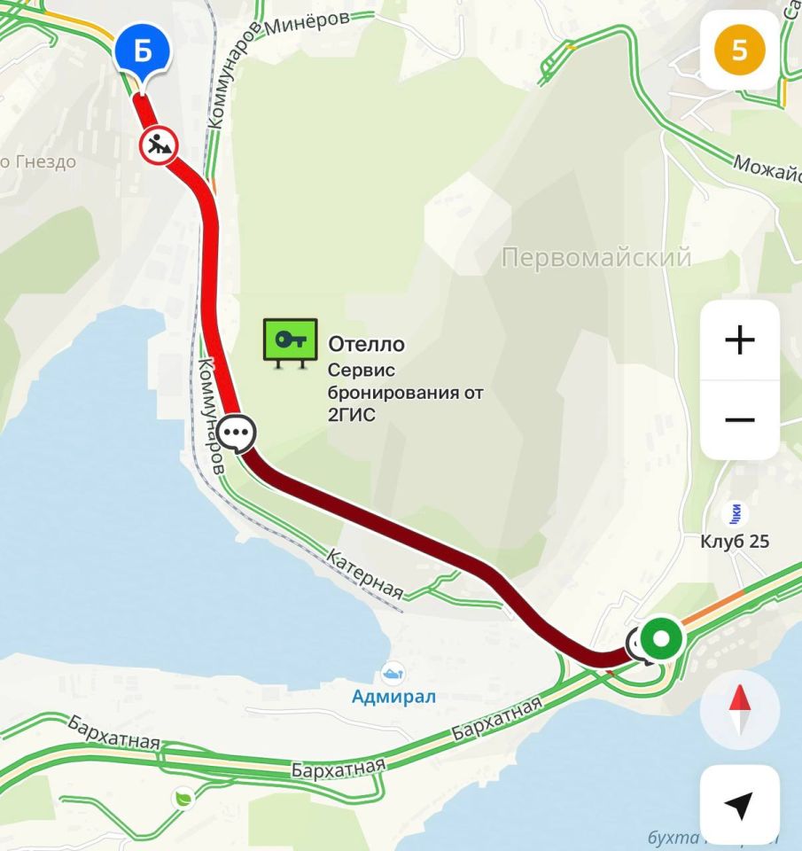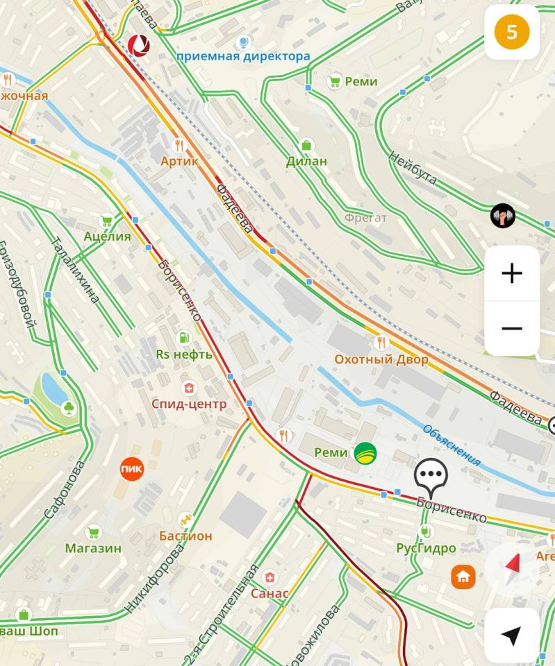 Отметим, согласно картам, что два альтернативных пути — через улицы Борисенко и Фадеева — сейчас также скованы пробкой. Причина коллапса на улице Фадеева — дорожные ямы, образовавшиеся после дождей. А на Борисенко, как мы предполагаем, такой затор возник из-за остальных водителей, пытающихся объехать пробки на улицах Фадеева и Героев-Тихоокеанцев.