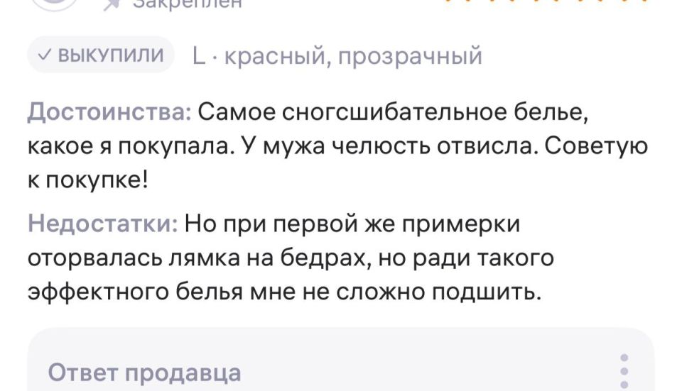 Одни пользователи в шоке: «Зачем выкладывать интимное фото на маркетплейс? Это же не OnlyFans!». Другие — активно лайкают и комментируют: «Красотка! Где заказать такой комплект?».