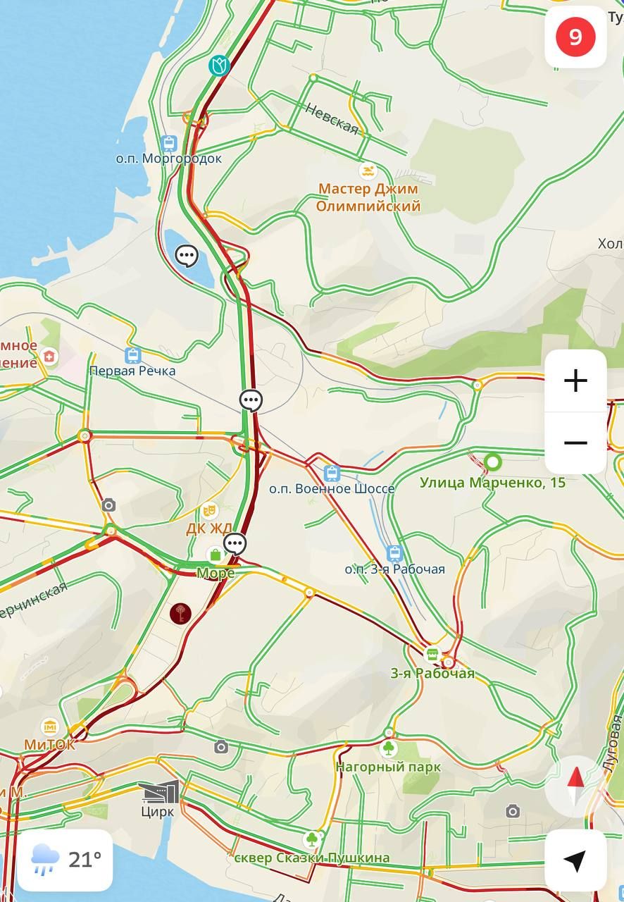 Особо остро стоит проблема выезда из города. Автомобилисты, направляющиеся в сторону пригорода, оказались заперты в многокилометровых пробках на выезде через низководный мост и трассу Седанка-Патрокл. Стоит и объездная трасса, в направлении ул. Маковской. То есть выезд заблокирован по всем направлениям.