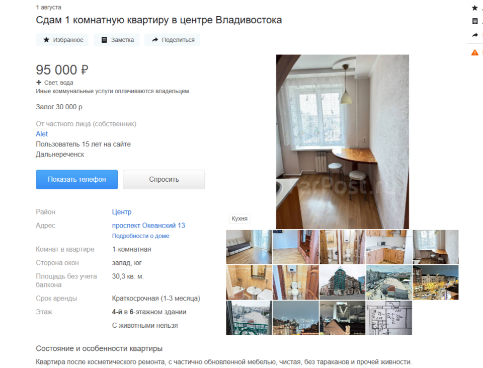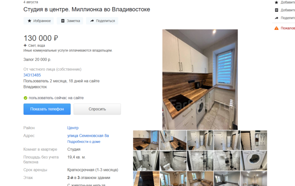 К слову, эту студию в самом центре Владивостока сдают на краткосрочный период. Видимо, продавец намерен неплохо подзаработать на ВЭФ. Объявление было опубликовано 4 августа. И всего за несколько дней набрало 200 просмотров.