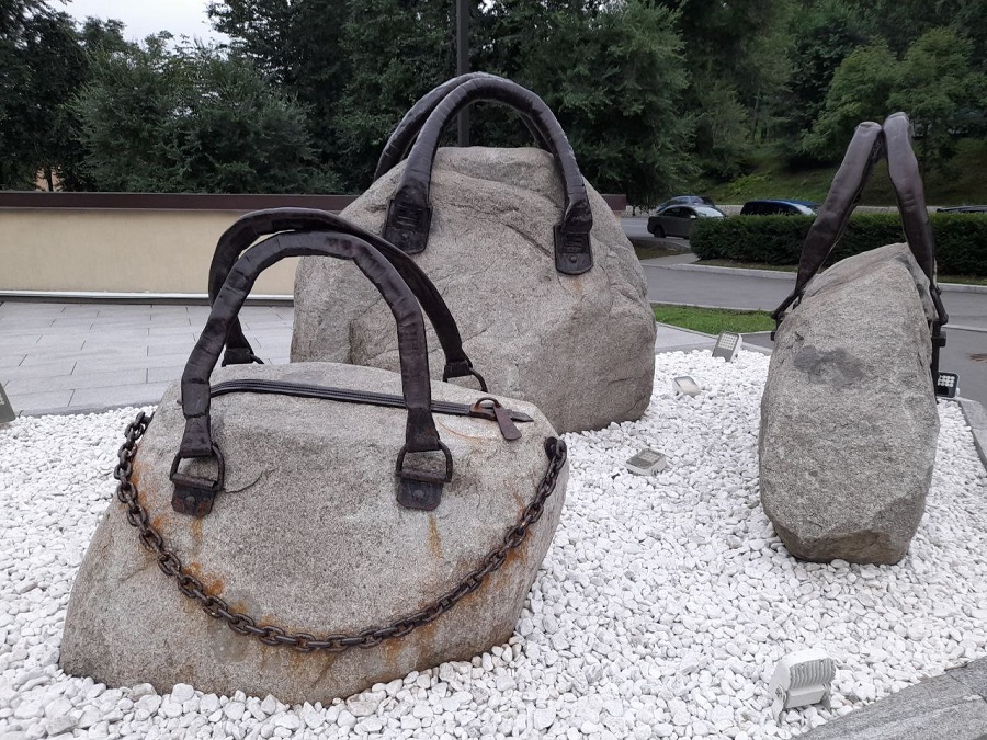 Арт-объект не имеет авторства, потому что производится промышленным способом — екатеринбургской компанией «УралГеоКамень». Каждый такой «саквояж» — да, уникален, поскольку двух одинаковых необработанных камней не бывает. Если прайс-лист не врёт, то камни-сумки во Владивосток приехали не откуда-нибудь, а с Эльбруса.