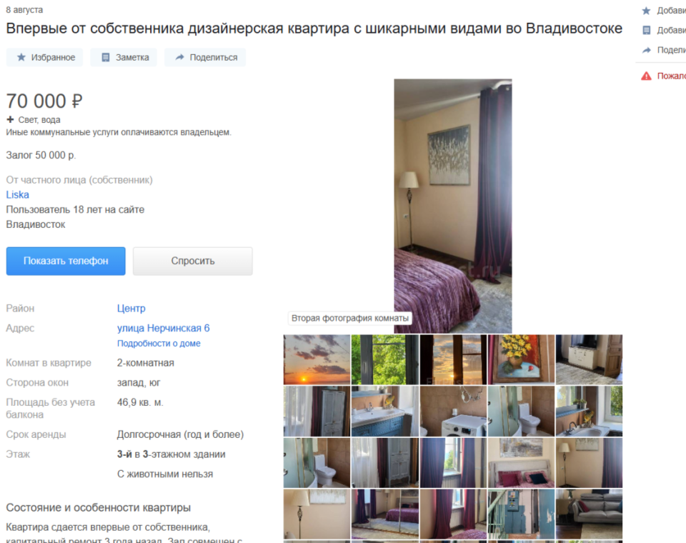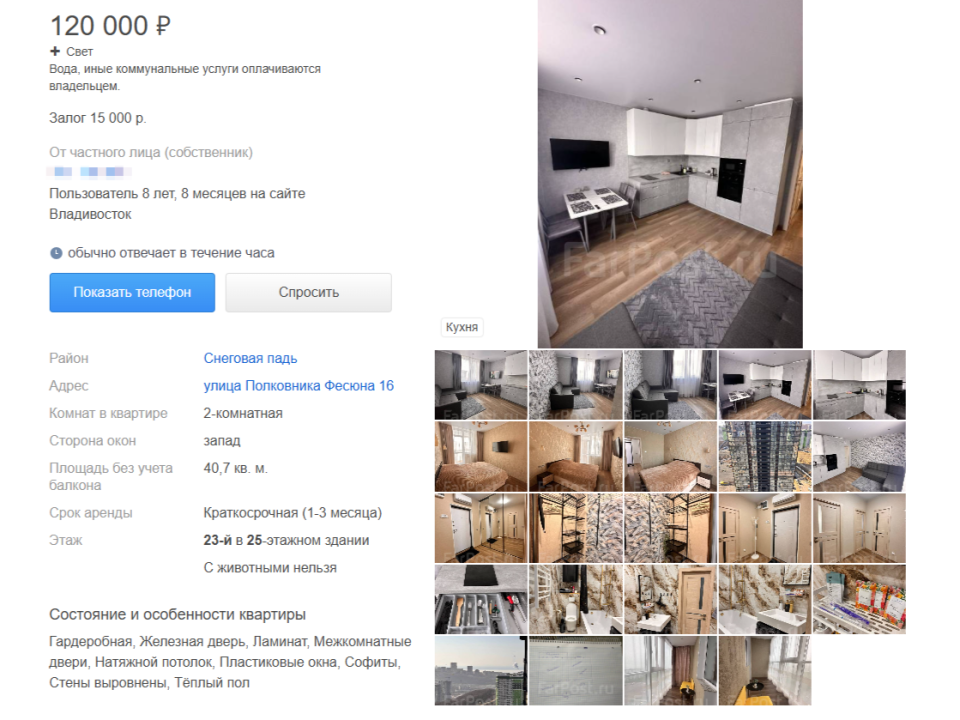 Цены явно завышены. Особенно вызывают вопросы те владельцы, которые сдают квартиры на окраинах города по ценам, сопоставимым с ценами в центре. Например, продавец предлагает краткосрочную аренду (от 1 до 3 месяцев) двухкомнатной квартиры в микрорайоне Снеговая Падь за 120 тысяч рублей в месяц. В стоимость включены свет, вода и другие коммунальные услуги, которые оплачиваются владельцем. При этом необходимо оставить залог в размере 15 тысяч рублей.