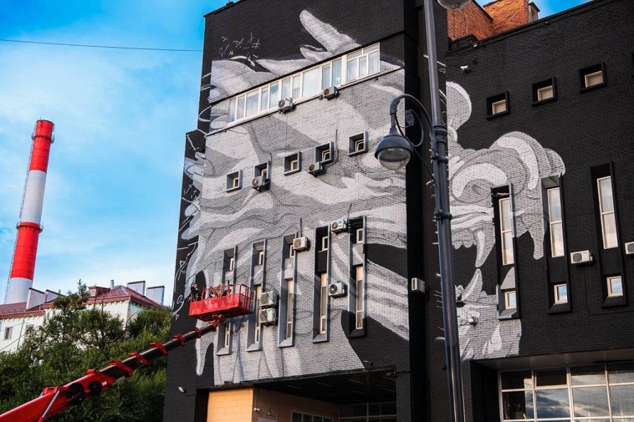 Портрет дракона — белое на чёрном — украсил фасад спорткомплекса «Олимпиец» на набережной Спортивной гавани во Владивостоке. Полностью арт-объект «На Восток» будет готов до конца текущей недели, сообщает PRIMPRESS.