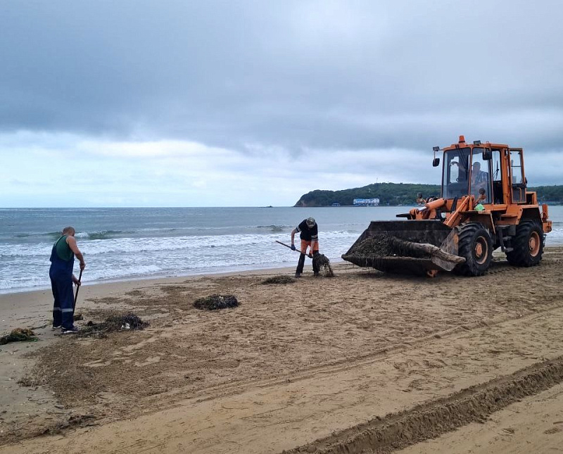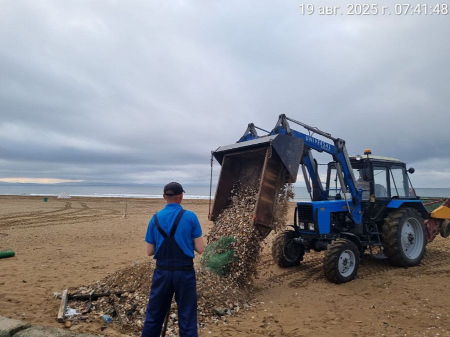 Работы стартовали рано утром: специализированная техника просеивает песок, удаляя мусор, ракушки и мелкие камни. Одновременно рабочие вручную собирают крупный мусор и водоросли.