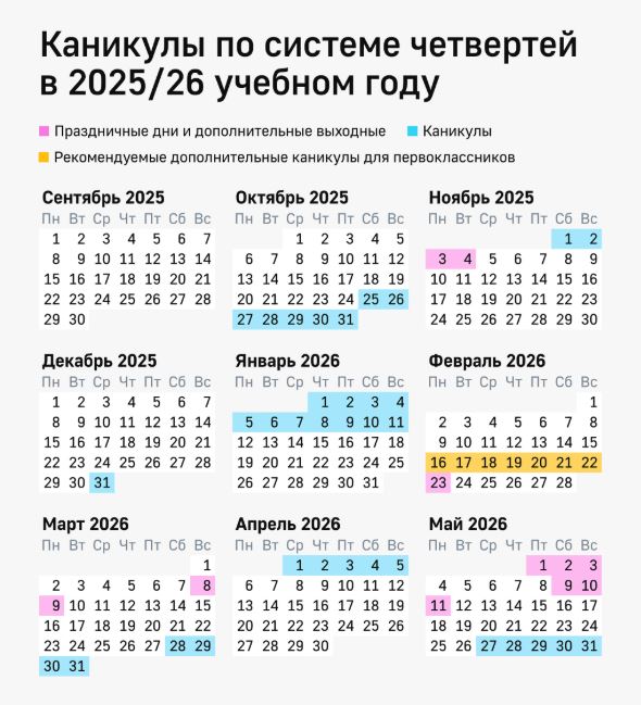 Так, в первую очередь специалисты представили расписание каникул для тех школ, которые учатся по четвертям. Учащиеся таких школ смогут отдохнуть осенью с 25 октября по 2 ноября. Причем к этому периоду добавятся еще праздники: выходной 3 ноября и День народного единства 4 ноября.