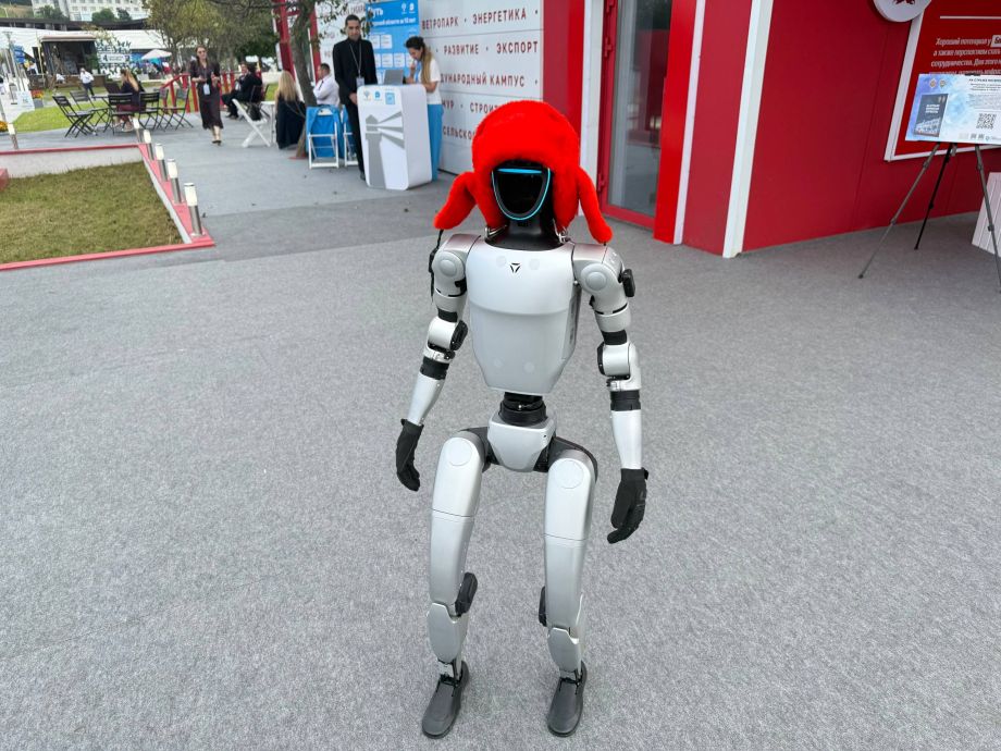«У меня всё хорошо, аккумулятор на 80 %. Я полон энергии и готов к работе. Приглашаю посетить наш павильон. Здесь мы рассказываем, как строим будущее уже сегодня».