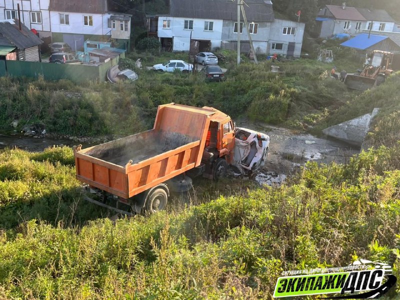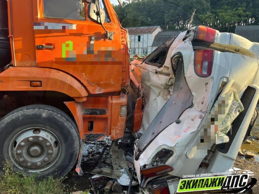 По предварительным данным, водитель многотонного автомобиля потерял управление на спуске. КамАЗ сорвался вниз на высокой скорости и буквально раздавил припаркованную Mitsubishi Delica.