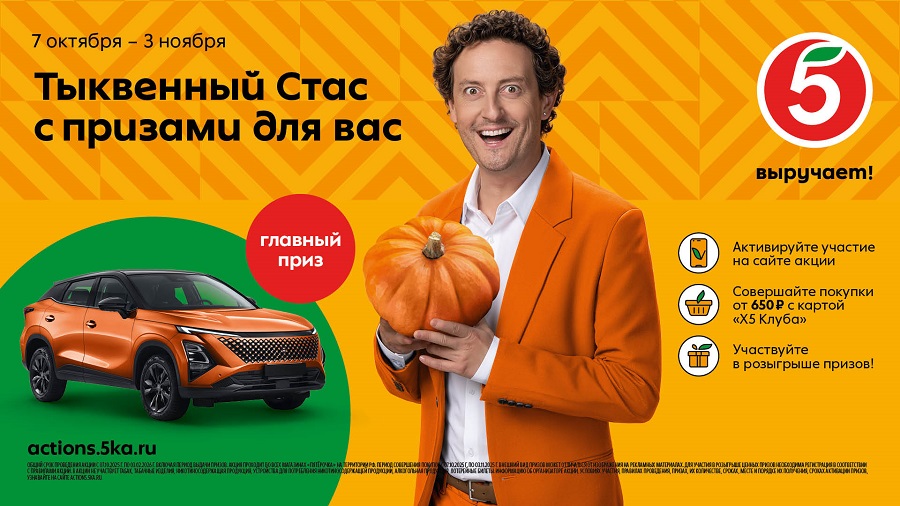 Розыгрыш стильного оранжевого автомобиля, путешествия по России и других ценных призов ждут участников новой сезонной акции торговой сети «Пятёрочка» — «Тыквенный Стас». Лицо кампании — собственно сам Тыквенный Стас, харизматичный актёр и шоумен Стас Ярушин. Для участия достаточно совершать покупки в магазинах сети до 3 ноября.