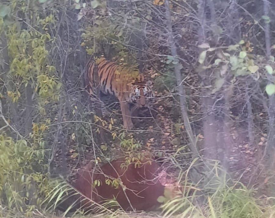 Жители Приморья, проезжая на машине по дороге близ Находки, заметили в кустах рыжего зверя. Как оказалось, животное охраняло мертвую корову, которая, судя по всему, стала его жертвой. Когда автомобиль остановился, тигр бросился в его сторону, однако водитель успел среагировать и отъехать.
