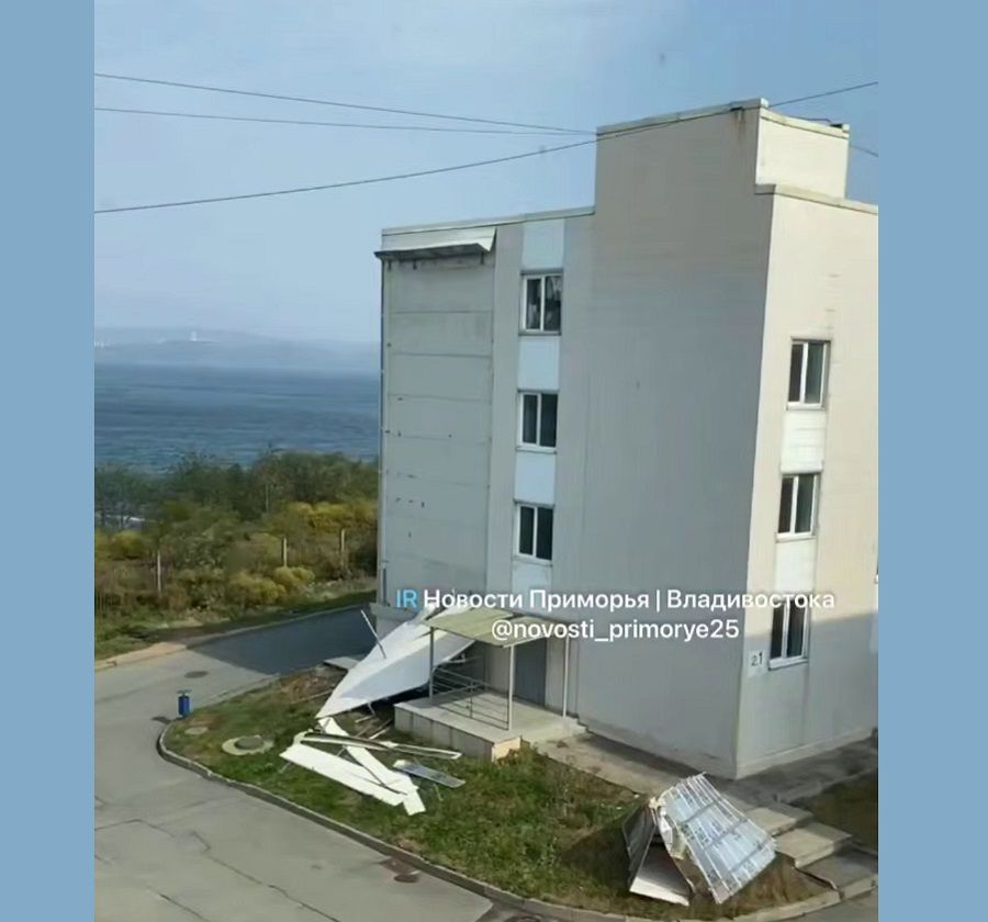 Усиление ветра не могло не сказаться внешнем виде города, а особенно острова Русский — ветер сорвал плохо закреплённую обшивку стены на здании общежития ДВФУ. Кадры с образовавшейся голой стеной студенты университета опубликовали в социальных сетях. Пока представители ДВФУ не прокомментировали эту ситуацию.