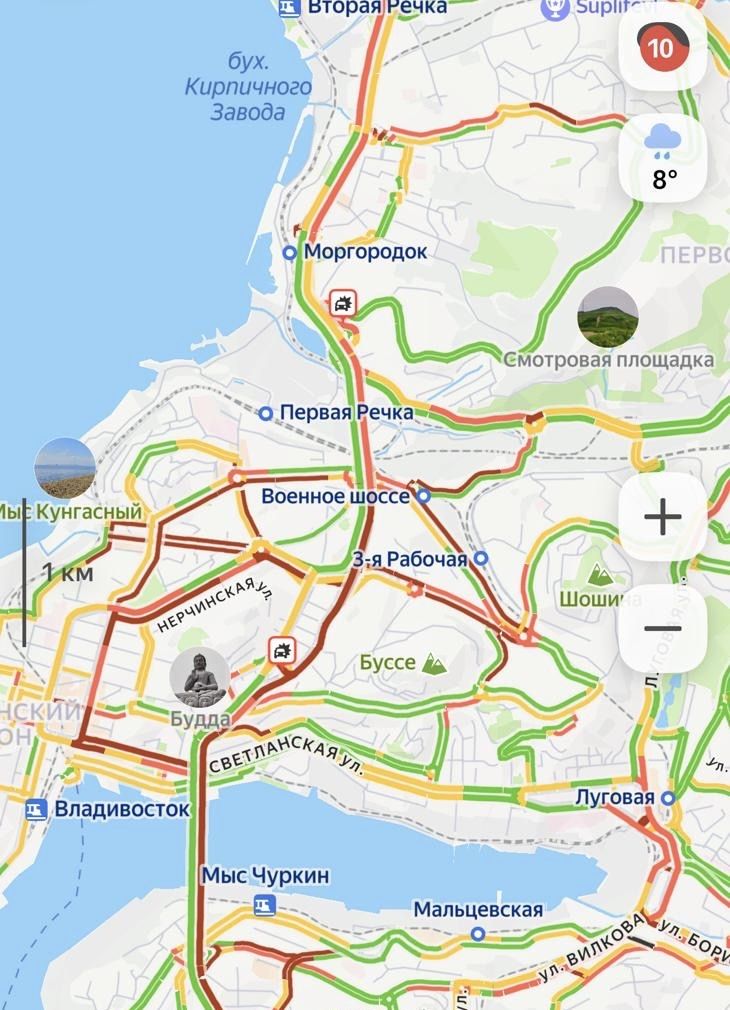 Пробки сконцентрированы на ключевых сквозных дорогах: от Патрокла до Некрасовского путепровода через Золотой мост все «колом», как из центра города до путепровода через Первую речкку. Улицы Светланская, Фадеева, район Третьей рабочей - то же самое. И, разумеется, аналогичным образом дело обстоит в районе Второй Речки.