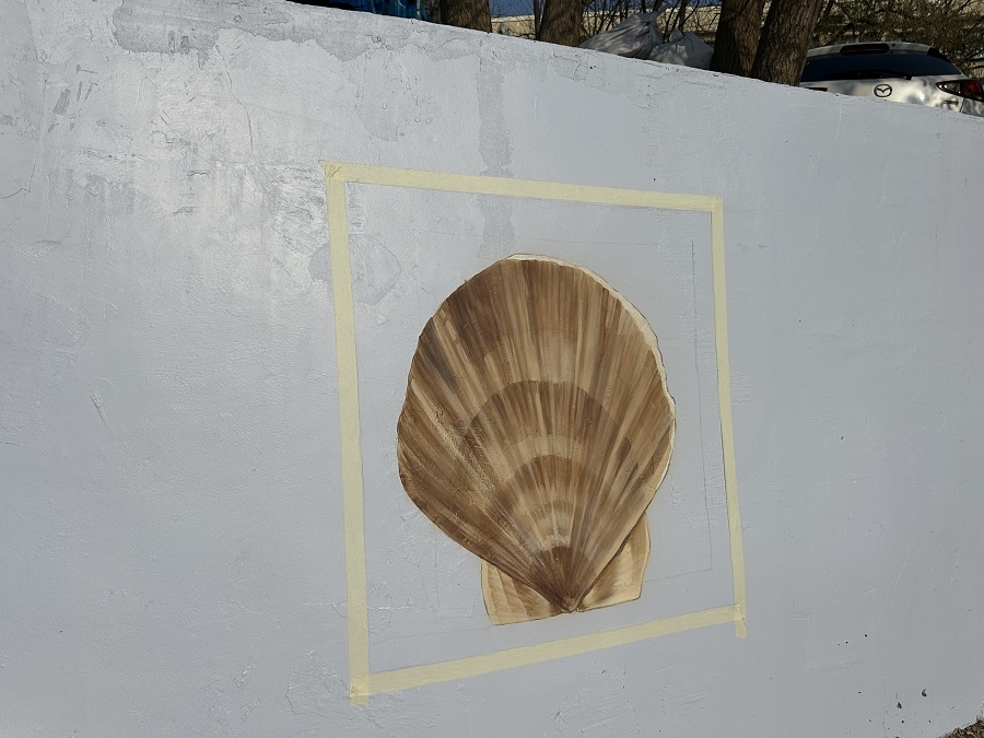Художница Ксения Илларионова параллельно с монтажом мозаичного панно рисует возле остановки раковину гребешка. Арт-объект будет комбинированным — художественно-мозаичным.