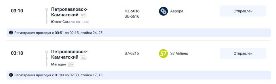 Те рейсы, что ещё не вылетели на Камчатку, а именно S7-6216, HZ-5617 и SU-5617, задерживаются на три-четыре часа.