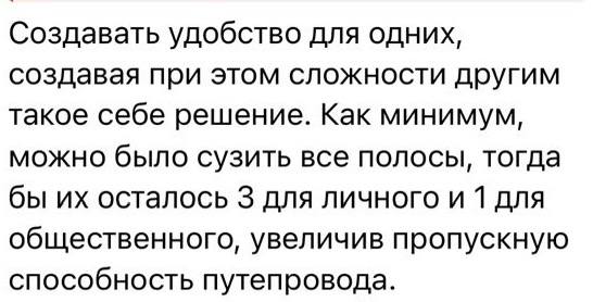 Однако тестовое внедрение автобусной полосы на Некрасовском путепроводе, которое провёл ЦОДД, показало неоднозначные результаты. С одной стороны, работа общественного транспорта в самом деле стала эффективнее: время в пути для автобусов сократилось на 25–50%. С другой стороны, заторы для остальных автомобилистов усугубились.