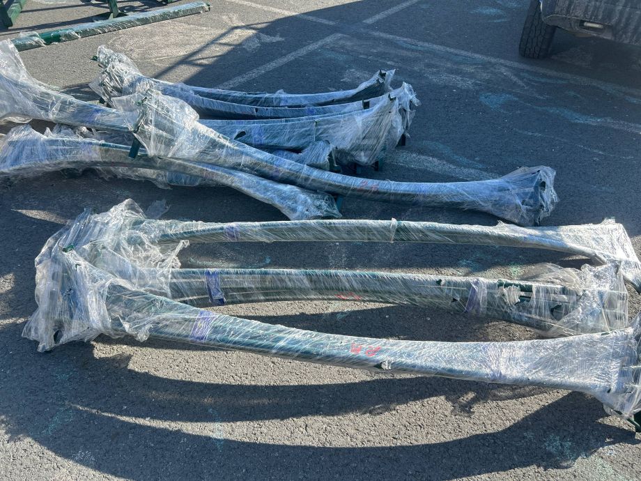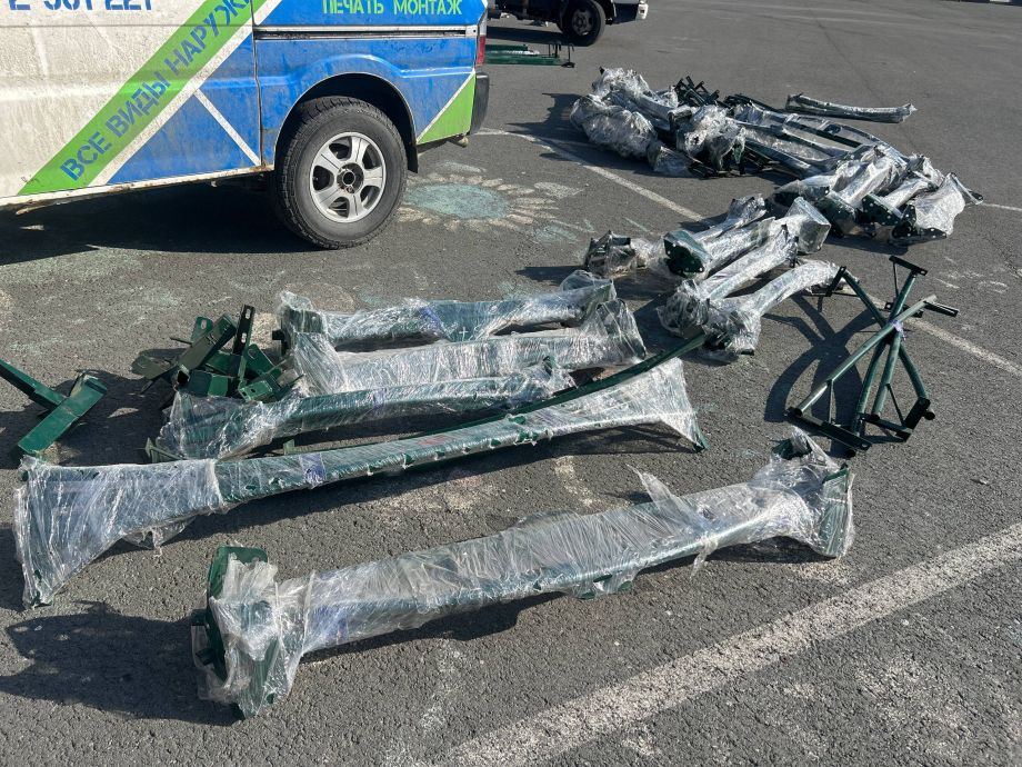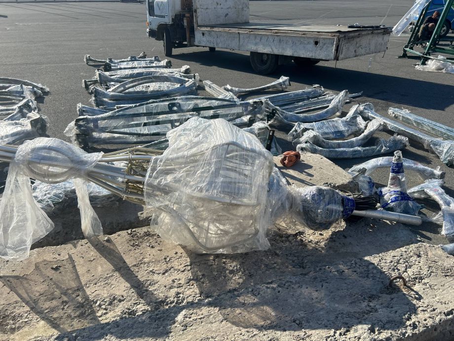 Работы начались с утра пятницы. Нижняя часть массивного металлического каркаса прочно стоит на асфальте. Рядом разложены остальные элементы конструкции, которые рабочие совсем скоро превратят в двадцатиметровую ёлку.