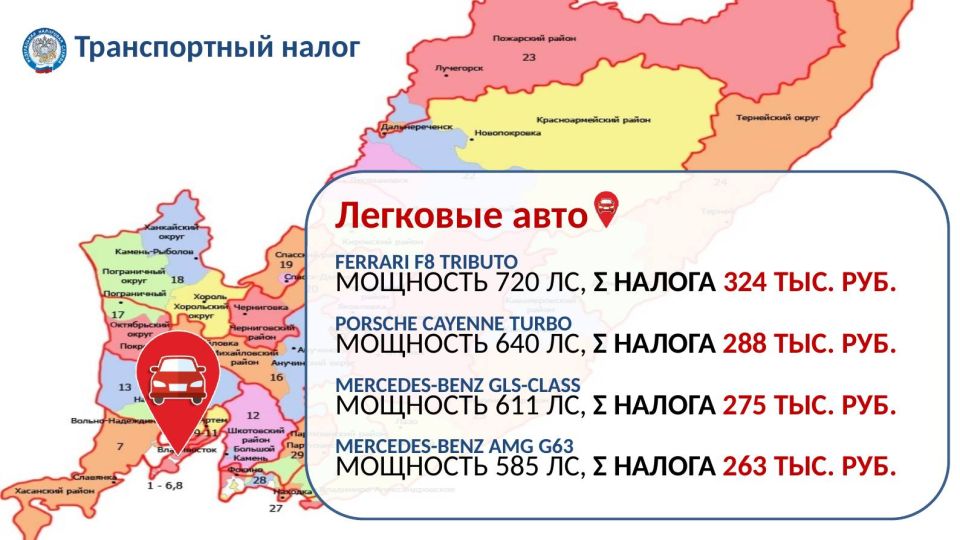 Естественно, что всех интересуют конкретные суммы, которые начислены или уплачены по каждому виду налогов. Ведомство озвучило «рекорды» по Приморскому краю. Наиболее актуален в самом автомобилизированном городе России Владивостоке транспортный налог: владелец Ferrari F8 Tributo заплатил 324 тыс. рублей, за Porsche Cayenne Turbo уплачено 288 тыс. рублей, за Mercedes-Benz GLS — 275 тыс., за Mercedes-AMG G63 — 263 тыс. рублей. Суммы начислений на водный транспорт еще солиднее: налог на танкер с мощностью 5384 л.с. составил 807 тысяч рублей, на яхту — 502 тысячи, на моторную лодку — 420 тысяч, а на катер — 345 тысяч. Воздушный транспорт оказалася даже дешевле люксовых иномарок: хозяин вертолета Ми-2 заплатил 160 тысяч, а владелец самолета — 133 тысячи рублей.