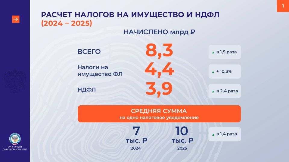 Поступление имущественных налогов в сумме 4,4 млрд. рублей ожидают приморские налоговики от местных налогоплательщиков по итогам кампании 2025 года. Сроки уплаты истекают 1 декабря, начисления по всем видам имущественных налогов выросли в этом году практически в 2,5 раза. Об этом говорилось на пресс-конференции в УФНС России по Приморскому краю во вторник, 25 ноября, на котором побывал корреспондент PRIMPRESS.