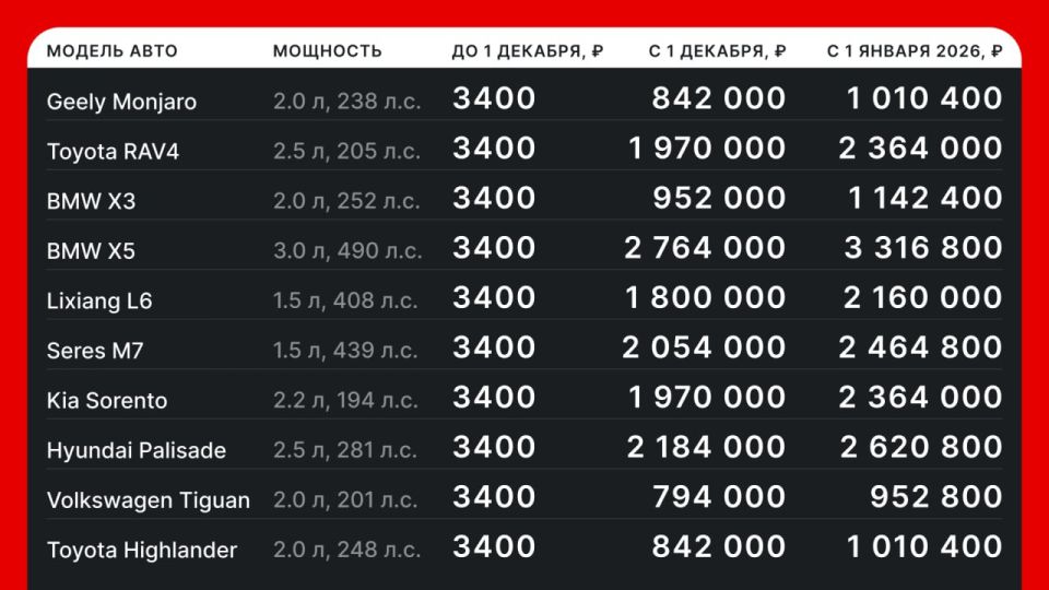 Однако шумиха стала шумихой не просто так. Это логичное продолжение общественного негодования по поводу общей политики импорта автомобилей. Сегодня, 1 декабря, в России вступили в силу новые правила расчета утильсбора. Льгота для машин с двигателями мощнее 160 л.с. отменена. Ранее за такой автомобиль возрастом до трех лет платили всего 3,4 тыс. рублей, а теперь сбор рассчитывается по базовой ставке в 20 тыс. рублей с применением коэффициентов от объема и мощности двигателя. Для электромобилей и гибридов учитывается пиковая мощность, а это еще больше увеличивает платеж. Итого, как увеличатся цены, наглядно: